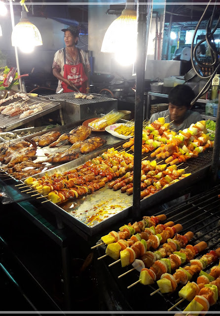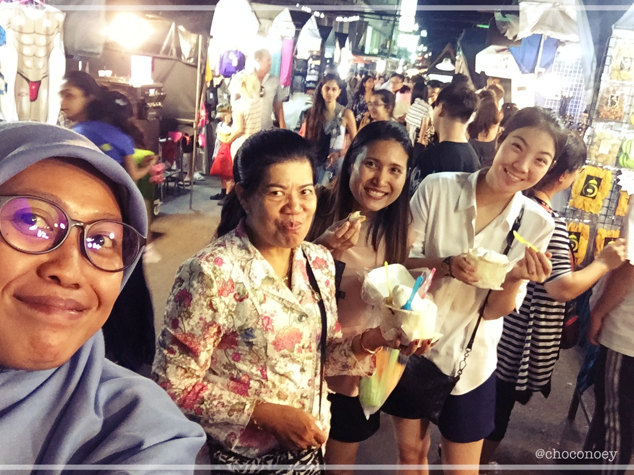 Night market ini ada dua blok dan lumayan panjang, trus pas peserta Thailand yang cewe-cewe ini nanyain mau makan apa,