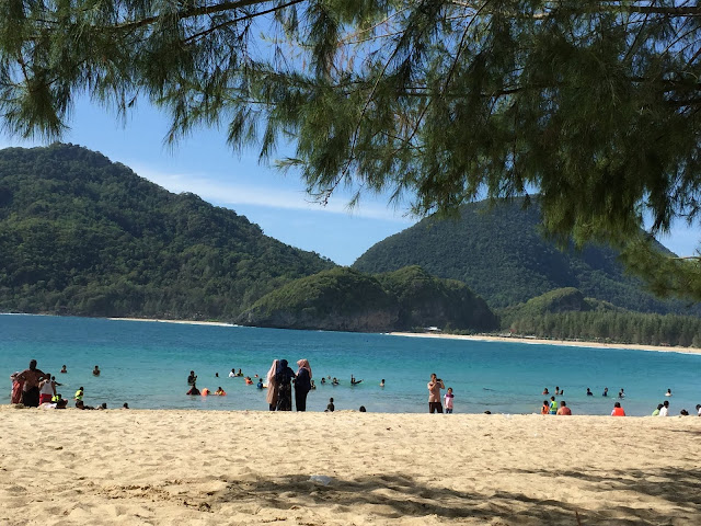 Meski panas, kami bahagia karena pemandangan pantai pasir putih yang begitu indah dan air laut yang sangat jernih. Yang unik dari pantai ini adalah beberapa pohon yang tumbuh di tepi pantai menjadi pusat spot foto wajib bagi para pengunjung.